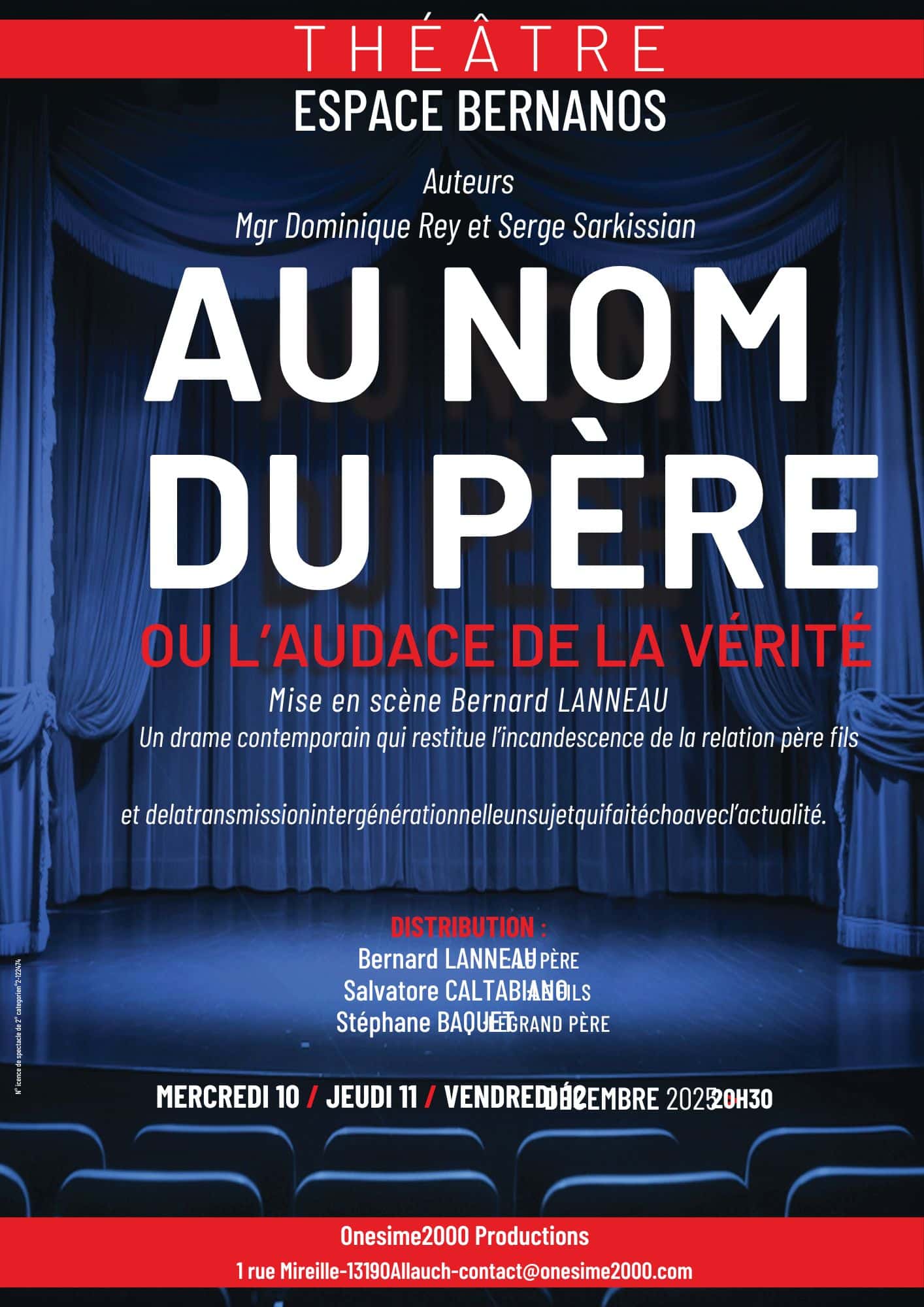Cette pièce, du livre de Mgr Rey, explore avec justesse et émotion les fragilités du lien père-fils, la transmission, la mémoire et la réconciliation. Elle parle de ces hommes qui s’aiment sans savoir se le dire, de ces générations qui se jugent sans vraiment se comprendre. Chacun de nous se reconnaît dans cette réflexion sur la paternité, les valeurs qu’elle porte, et la place qu’elle occupe dans un monde qui prétend parfois se bâtir « sans père ».