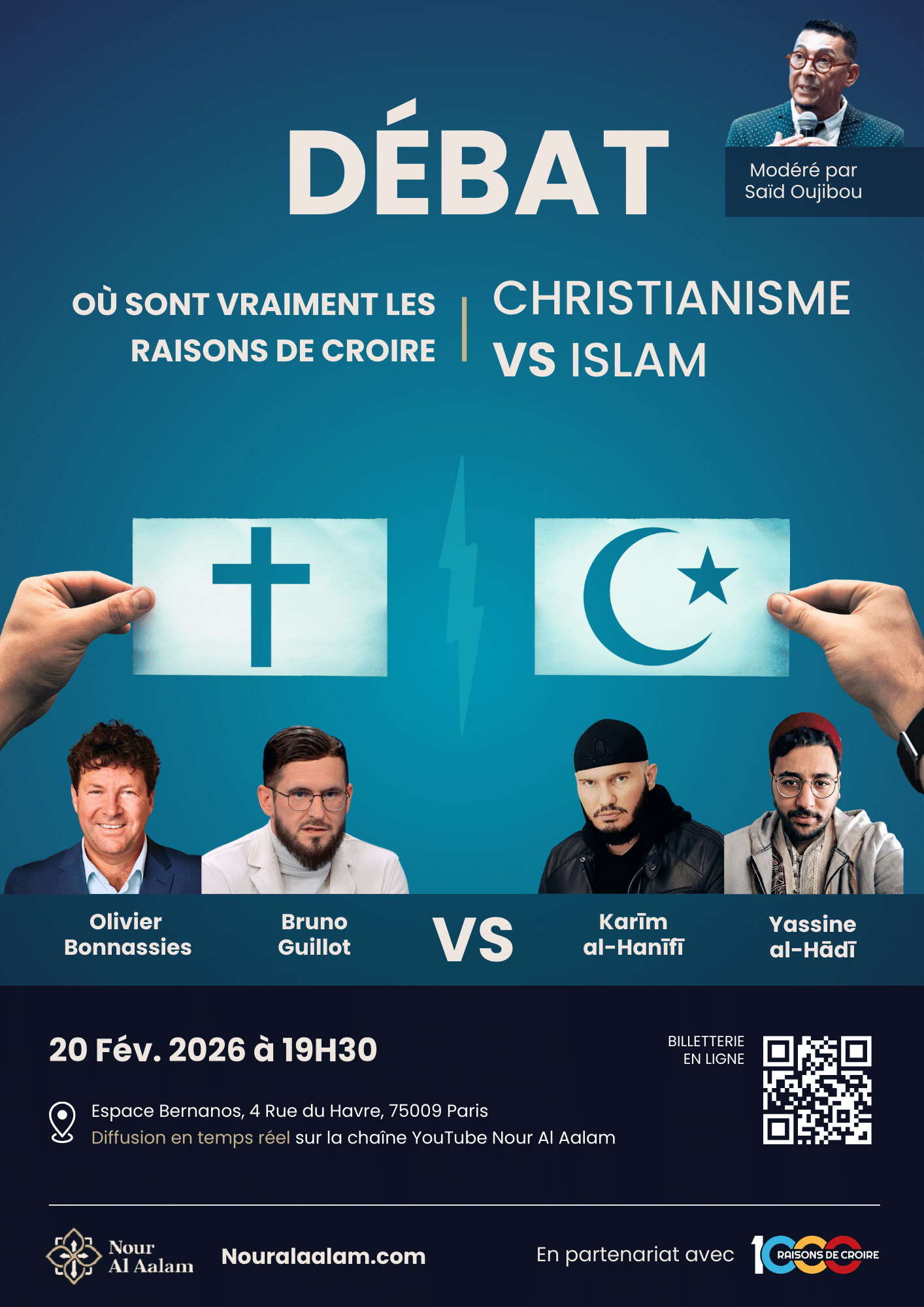 Cet échange mettra face à face Olivier Bonnassies et Bruno Guillot, auteurs et apologètes chrétiens, et Karim al Hanifi et Yanis Zittouni, apologètes musulmans, autour de la question fondamentale de la rationalité de la foi. Au-delà des dogmes, ce face-à-face interrogera la légitimité intellectuelle de l’adhésion religieuse : sur quelles preuves objectives peut-on fonder sa foi chrétienne / musulmane ?