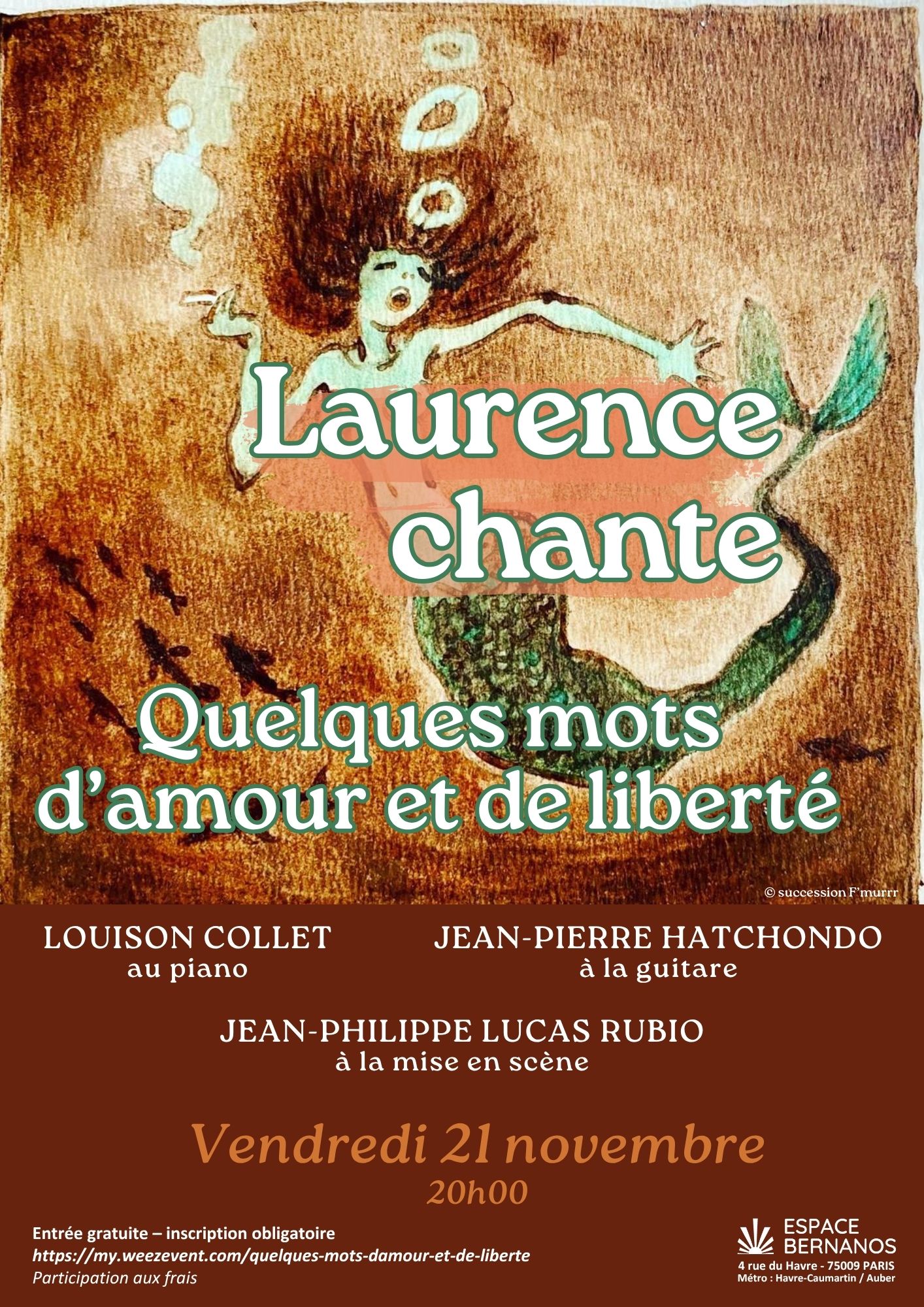 Initié et chanté par Laurence Faigenbaume, conçu avec Jean-Philippe Lucas Rubio qui en assure la mise en scène, ce spectacle vous embarque sur un chemin vers la lumière… Avec Louison Collet, au piano ; Jean-Pierre Hatchondo à la guitare et au chant.