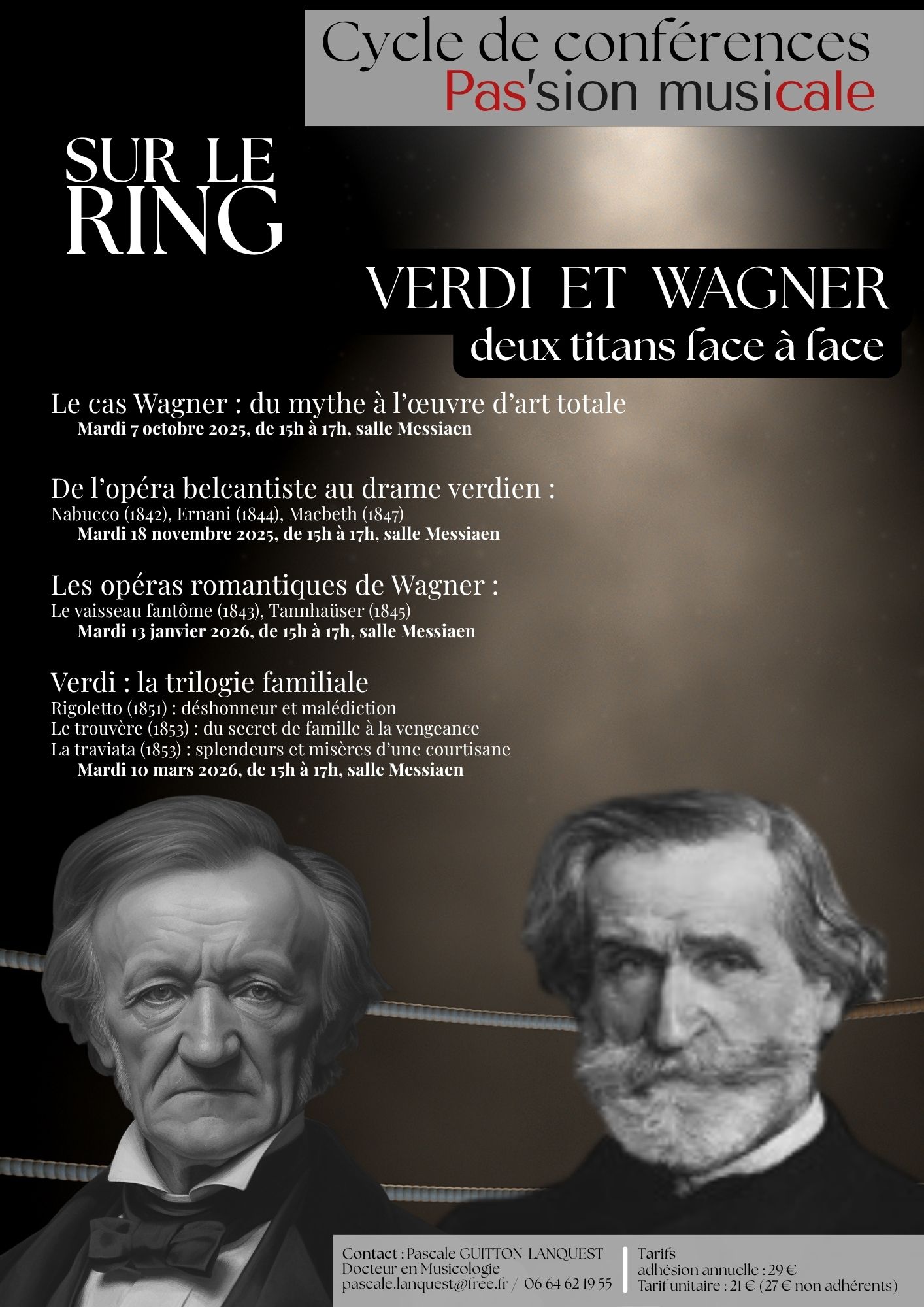 Au cours des quatre séances proposées, nous découvrirons ensemble quelques chefs-d’œuvre de ces deux titans de l’art lyrique, tous les deux nés en 1813.